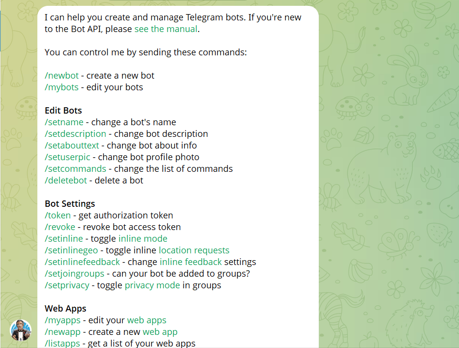 Вы можете управлять Telegram-ботом через BotFather. Например, изменить имя, настроить меню команд, добавить описание.