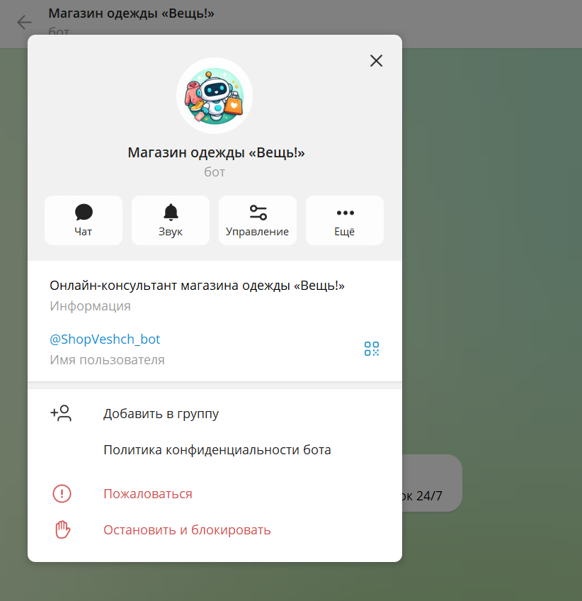 /setabouttext — внести короткое описание в профиле бота. Например, «Онлайн-консультант магазина одежды "Вещь!"».