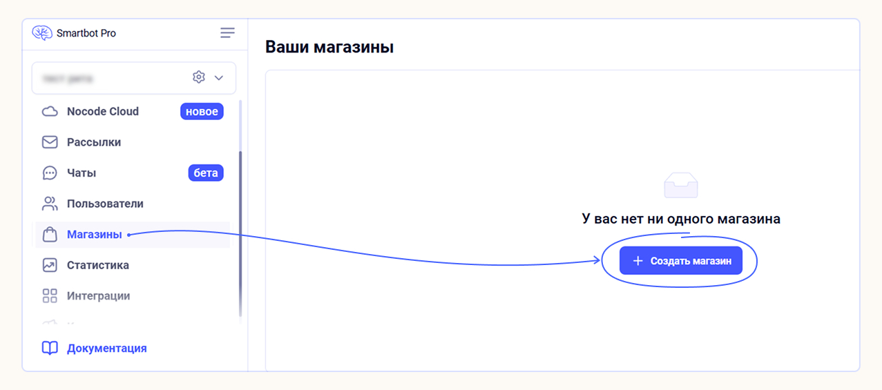 Выберите раздел «Магазины» в главном меню и нажмите на кнопку, как показано на скриншоте: