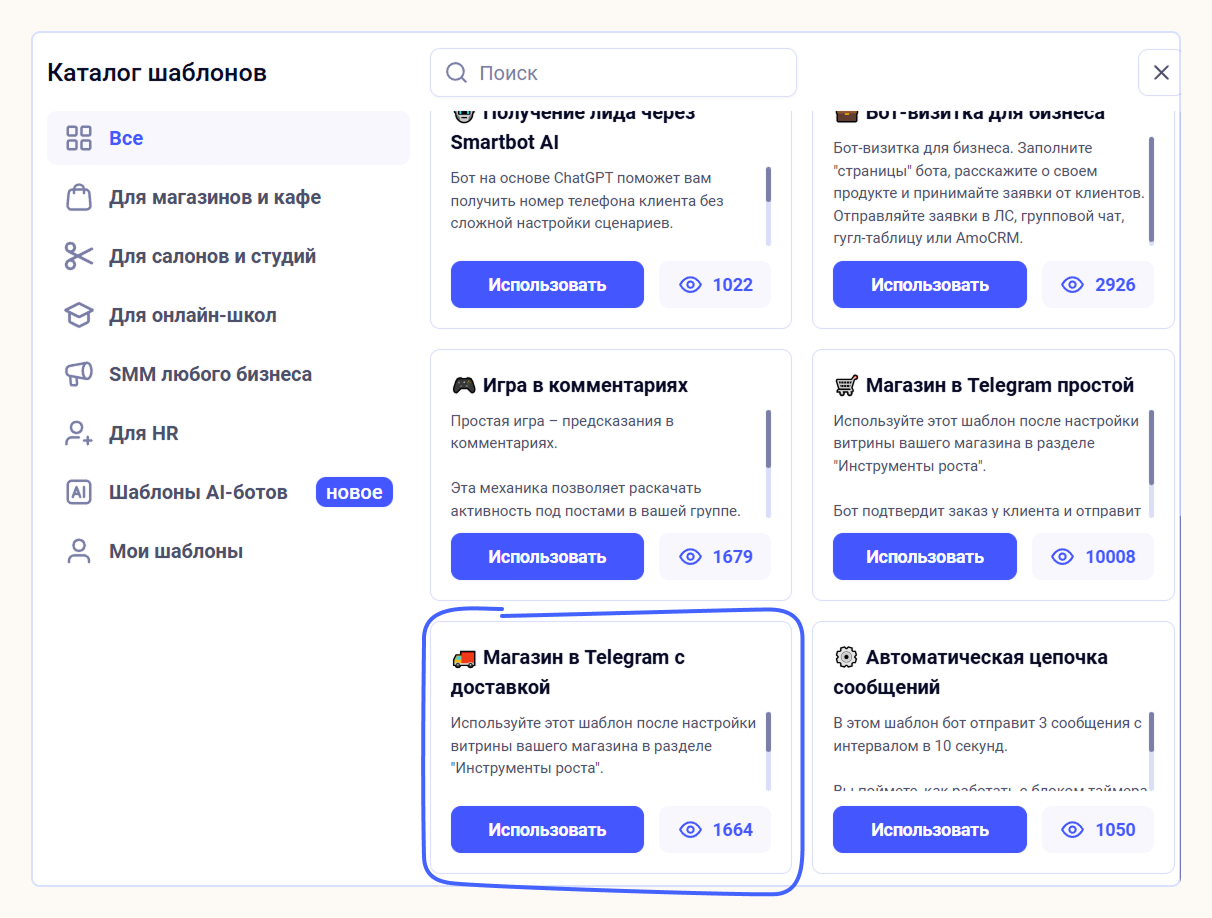 Зайдите в раздел «Сценарии», нажмите «Использовать шаблон» и выберите «Магазин в Telegram с доставкой».