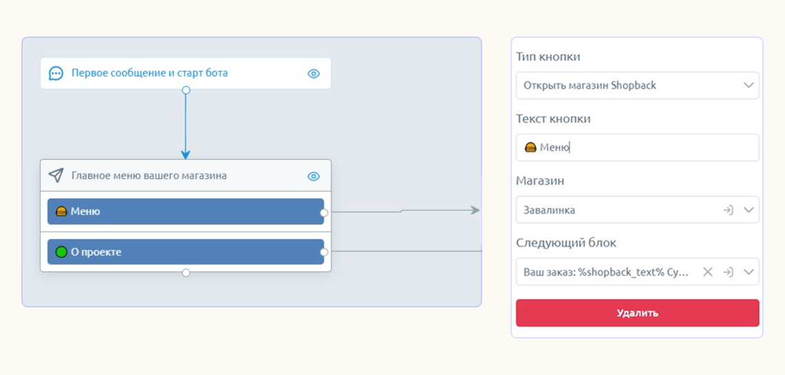 Чтобы пользователь открыл каталог товаров в Telegram-чате, нужно добавить магазин в сценарий. Выберите блок «Главное меню вашего магазина» и настройте кнопку для перехода: