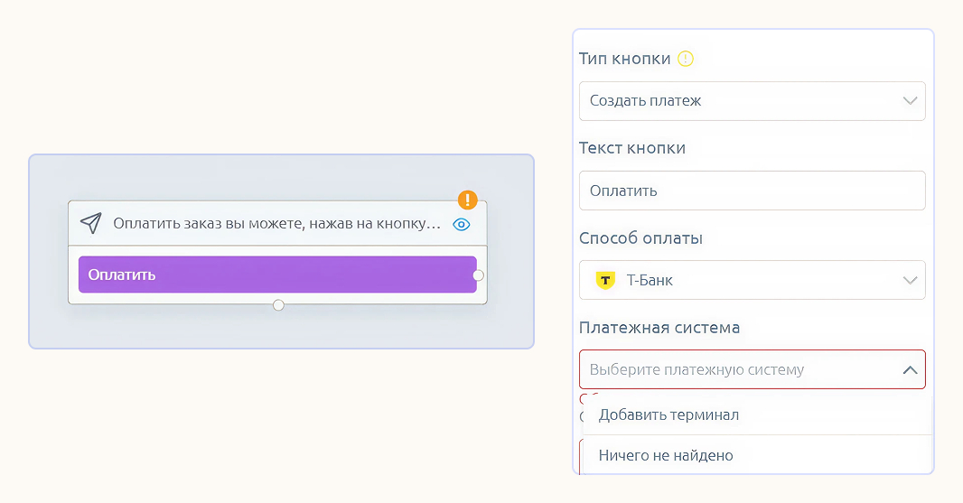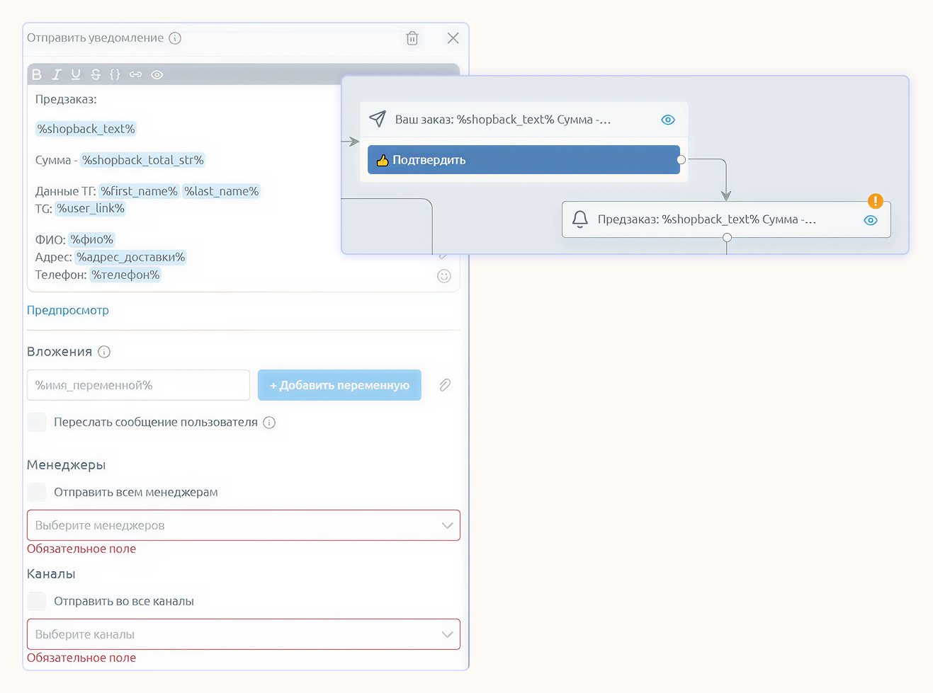 Дальше бот подтвердит заказ и отправит уведомление менеджеру, что клиент начал оформлять покупку. Выберите сотрудника и канал в боковом меню настроек — оно всегда открывается по клику на блок.