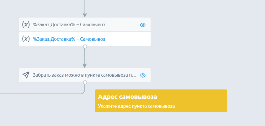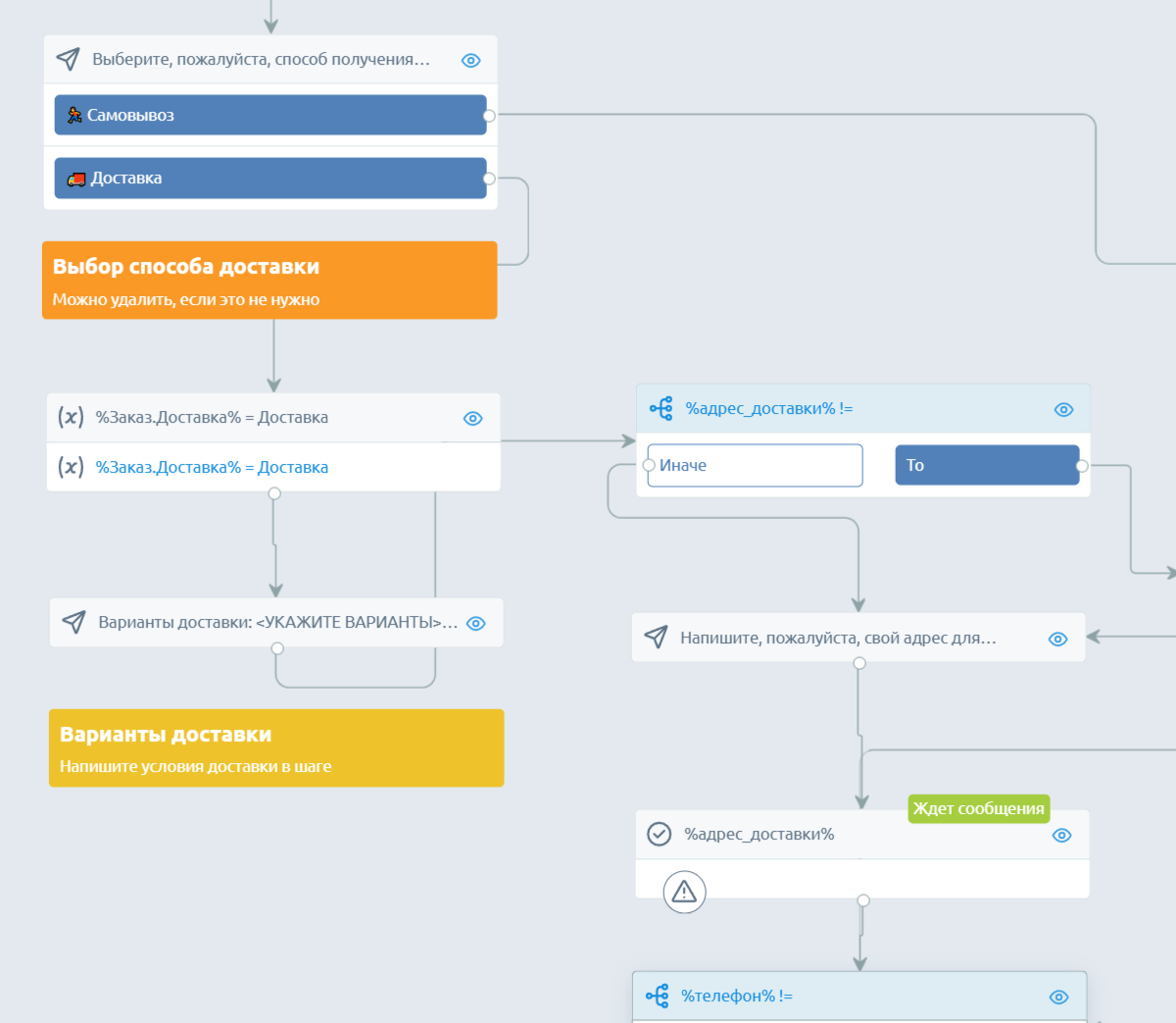 Доставка. Чат-бот уточнит адрес, телефон, ФИО и сохранит данные в соответствующие переменные — они уже созданы в сценарии. Вам нужно только добавить свой текст в блоки. Например, указать условия и варианты доставки.