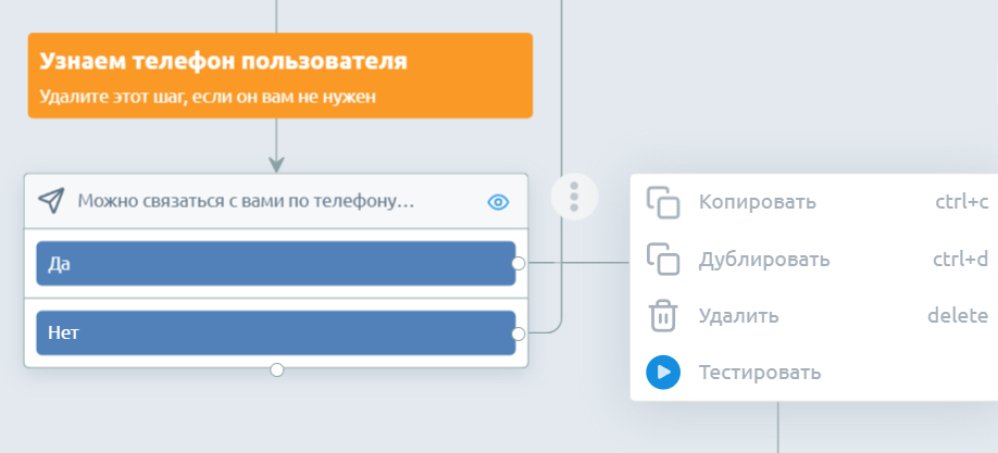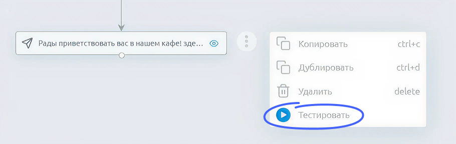В верхнем меню нажмите кнопку «Опубликовать». Проверить работу бота можно с любого блока. Кликните на иконку с тремя точками и выберите команду «Тестировать».