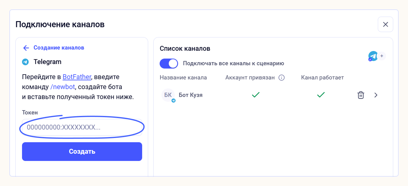 Откройте раздел «Каналы» в боковом меню, выберите мессенджер и вставьте токен от BotFather.