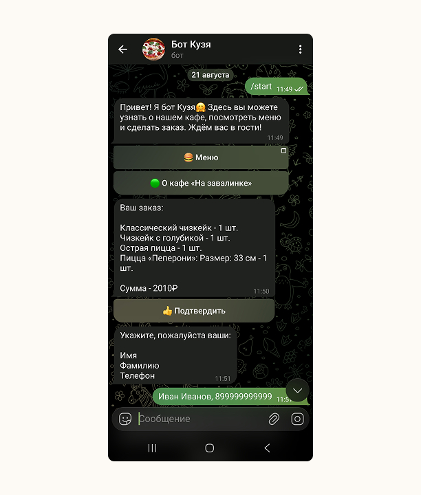 Самовывоз. Если пользователь выбирает этот способ, бот отправляет адреса пунктов выдачи, уточняет телефон и ФИО.