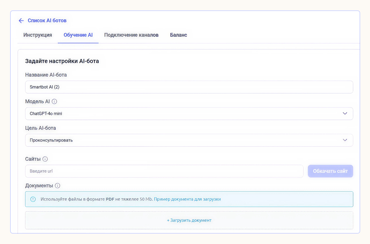 Подробную инструкцию, как настроить и обучить ИИ-ассистента, читайте в этой статье.