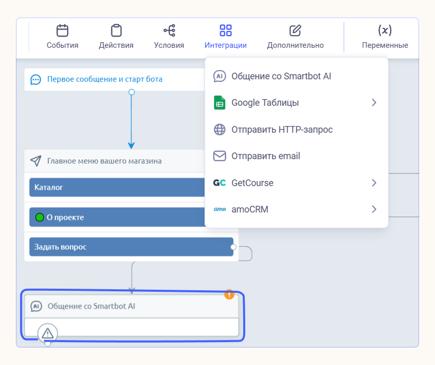Чтобы усилить сценарий, настройте ИИ-ассистента. Он понимает естественную речь, запоминает контекст и последовательно ведёт диалог.