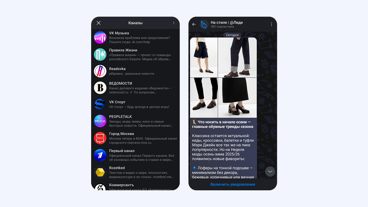 Аудитория. По данным МТС AdTech, в ноябре 2025 года количество уникальных пользователей Telegram в России достигло 105 млн человек. Основная аудитория — взрослая часть населения в возрасте 25-44 лет, а среднее время использования мессенджера — 50 минут в день.