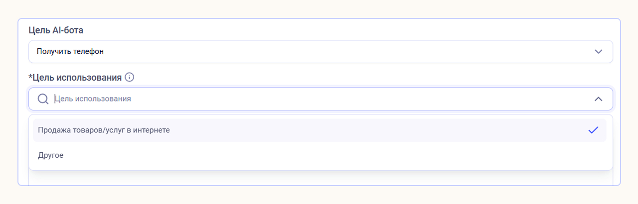 Цель использования. По умолчанию указана задача «Продажа товаров / услуг в интернете». Вы можете выбрать вариант «Другое» и написать свою цель.