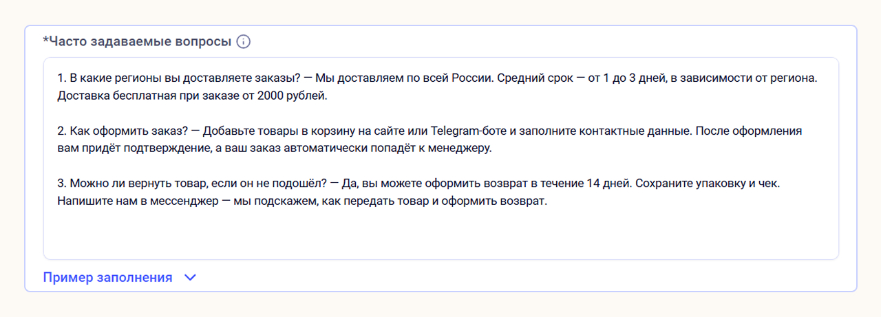 Часто задаваемые вопросы. Сформулируйте популярные запросы покупателей и напишите ответы на них. Например, в какие регионы возможна доставка, как оформить возврат и зарегистрироваться в программе лояльности.