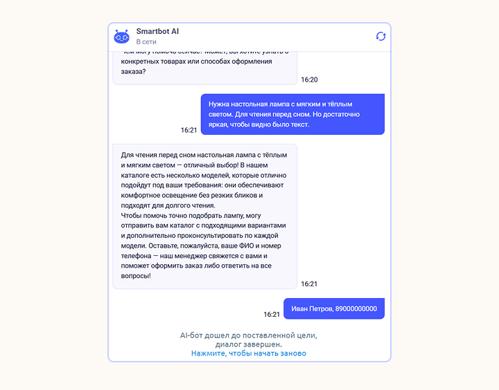 В режиме «Получить телефон» ИИ-ассистент ведёт диалог с пользователем и собирает данные: ФИО, потребности, контакты. Чтобы чат-бот мог консультировать клиентов, заполните следующие поля: