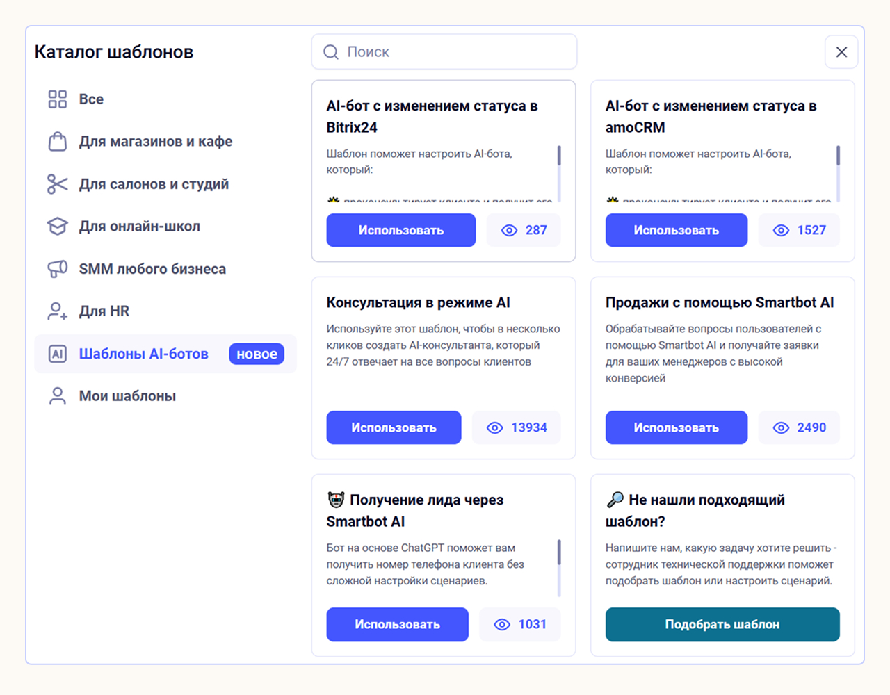 Вы можете выбрать шаблон для ИИ-ассистента или создать собственный алгоритм. На главной странице Smartbot в боковом меню кликните на раздел «Сценарии», а затем на кнопку «Использовать шаблон». Поставьте фильтр «Шаблоны AI-ботов».