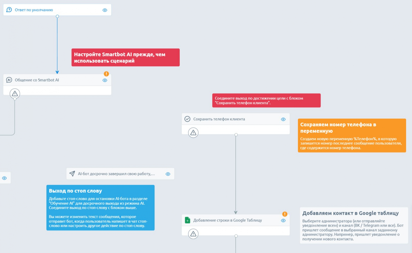 Получение лида через Smartbot AI. Простой шаблон с базовыми настройками: бот ответит на вопросы клиентов, узнает контакты, внесёт их в Google-таблицу и отправит уведомление менеджеру.