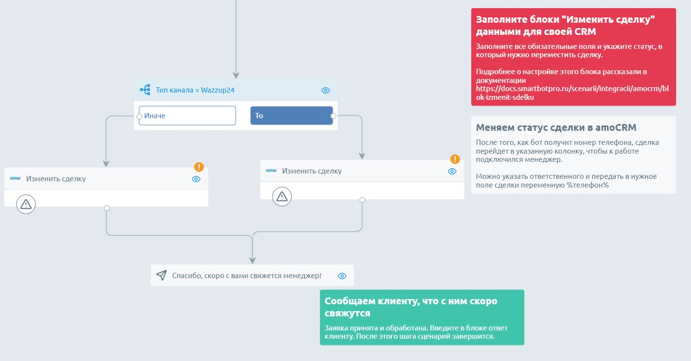 Основная логика действий уже сформирована в сценарии. Адаптируйте готовые блоки под свой проект: напишите текст приветственного сообщения, подключите встроенные интеграции с CRM и Google-таблицами и задайте параметры изменения сделок, если нужно.