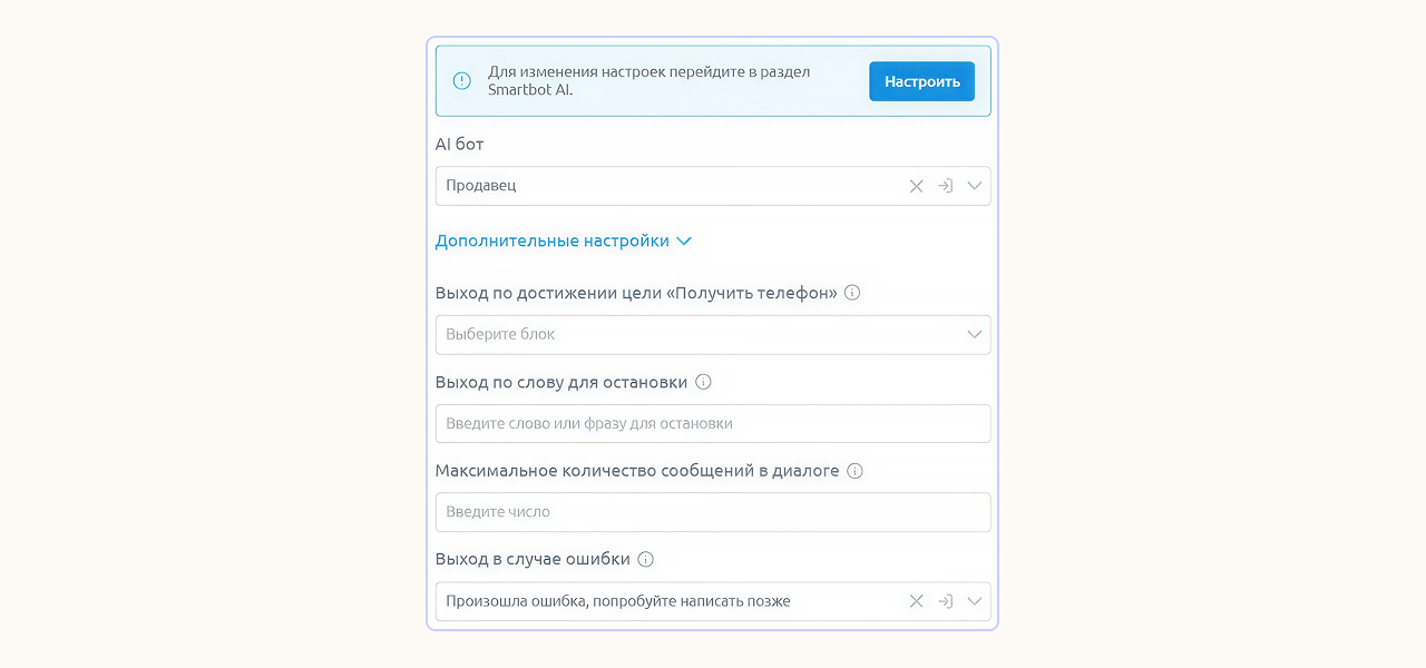 Также можно настроить выход из режима ИИ: когда цель достигнута, произошла ошибка и по стоп-слову. Например, перевести диалог на сотрудника, если пользователь напишет подобные фразы: «Оператор», «Позови человека» или «Хочу поговорить с менеджером».