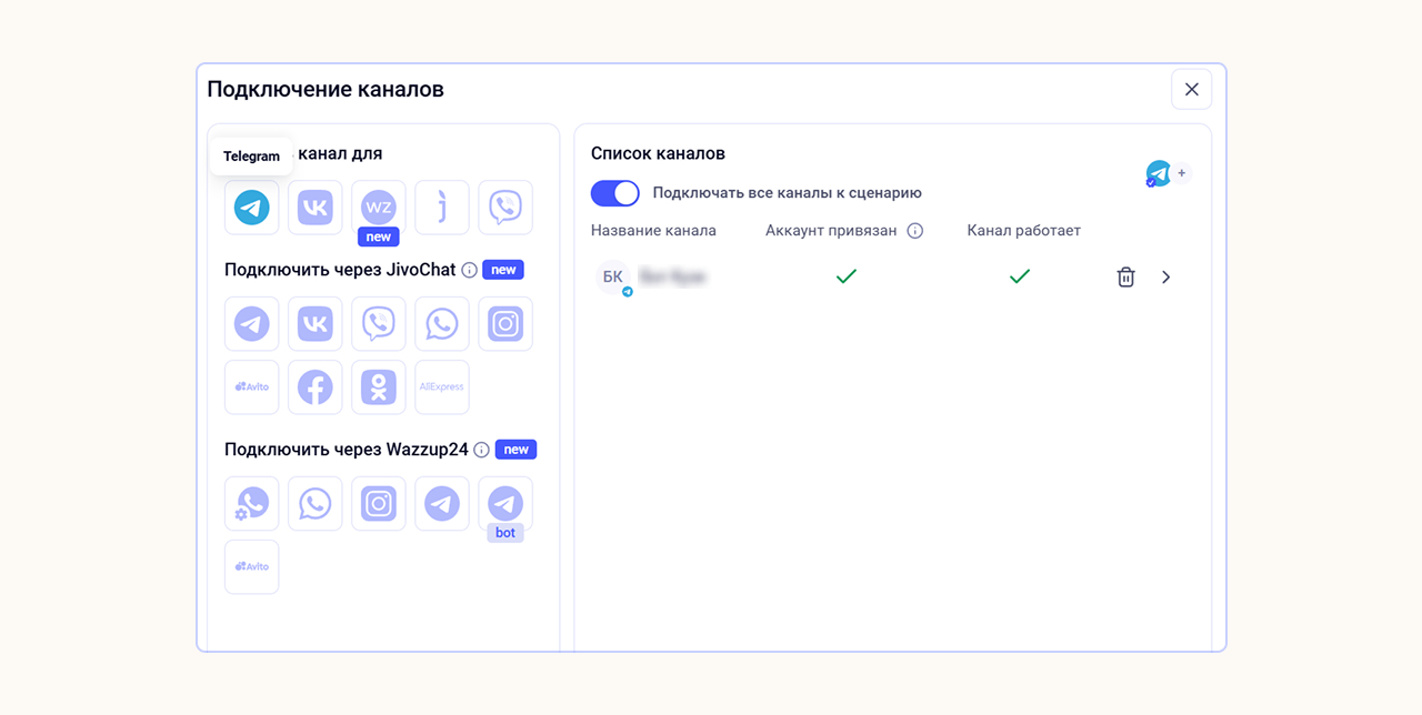 Перейдите в раздел «Каналы» и выберите нужный. Для примера покажем, как привязать ИИ-ассистента к Telegram.