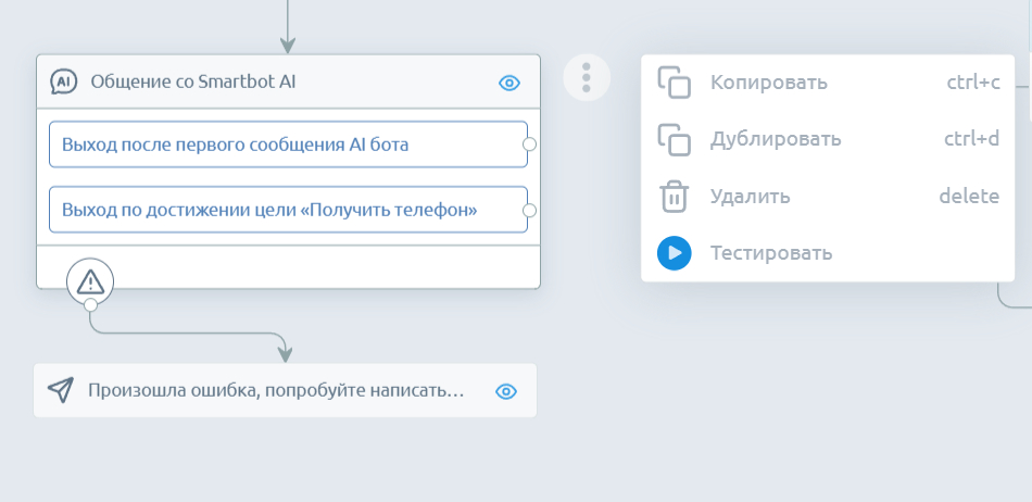 Откройте шаблон сценария, который подходит под ваши задачи, и добавьте в него ИИ-ассистента. Кликните на блок «Общение со Smartbot AI» и выберите название бота в боковом меню настроек.
