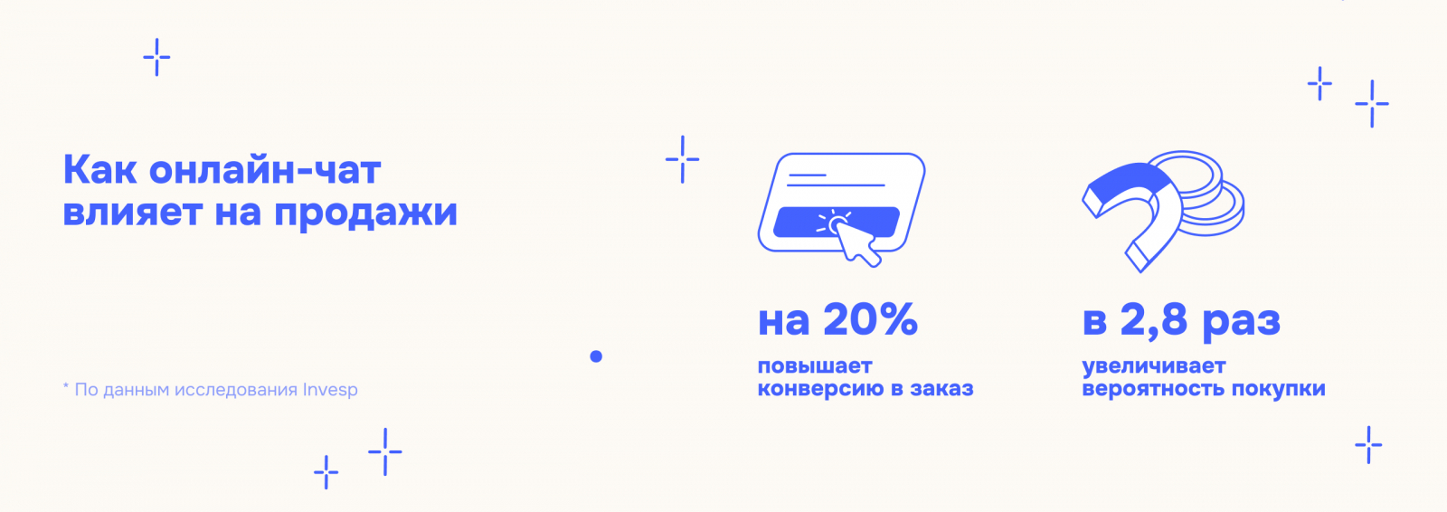 Рост конверсии в покупку. Онлайн-консультант на сайте работает как дополнительный канал продаж. Менеджер отвечает на вопросы, снимает возражения и предлагает сопутствующие товары. Такие персональные консультации в момент выбора помогают быстрее принять решение и увеличивают траты за одну покупку на 60%.