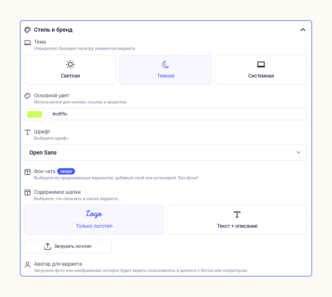Перейдите в раздел «Настройки виджета» и откройте вкладку «Стиль и бренд». Здесь вы можете менять основные элементы онлайн-чата: