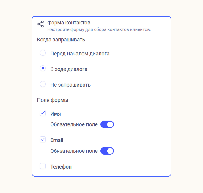 Форма сбора контактов. Укажите, когда запрашивать данные, и выберите необходимые поля: имя, email и телефон.
