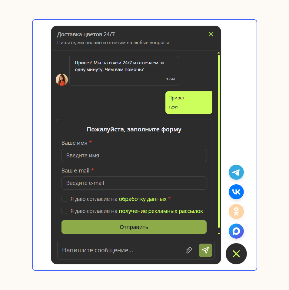Решение: разместите рядом с окном чата иконки мессенджеров и добавьте в них ссылку, чтобы посетитель мог перейти в удобный канал коммуникации. Так вы покажете заботливый сервис, ненавязчиво получите контакты клиента и сможете продолжить общение в любое время.