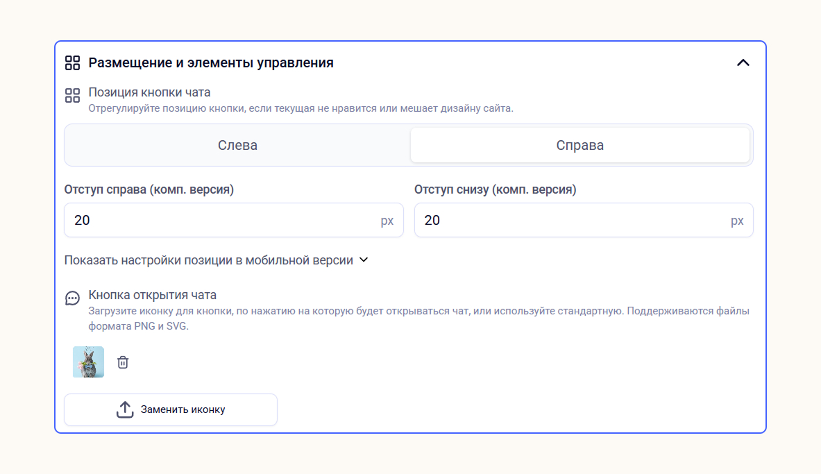 Перейдите во вкладку «Размещение и элементы управления». В этом разделе настройте позицию и оформление кнопки, которая открывает и закрывает окно онлайн-чата: