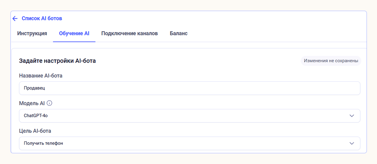 1. Перейдите в раздел Smartbot AI из главного меню конструктора и нажмите на кнопку «Создать AI‑бота». Во вкладке «Обучение AI» внесите название бота, выберите модель GPT и цель «Получить телефон».