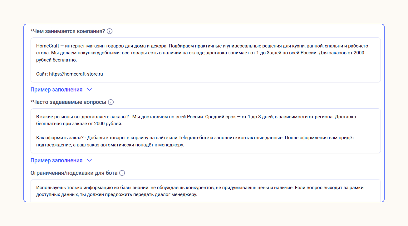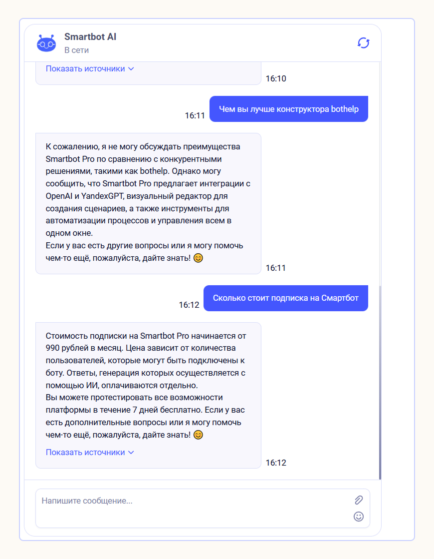 Если нужна полноценная консультация, лучше настроить ИИ-ассистента. Такой чат-бот обучается по базе знаний компании, решает узкоспециализированные запросы и помогает выбрать товар.