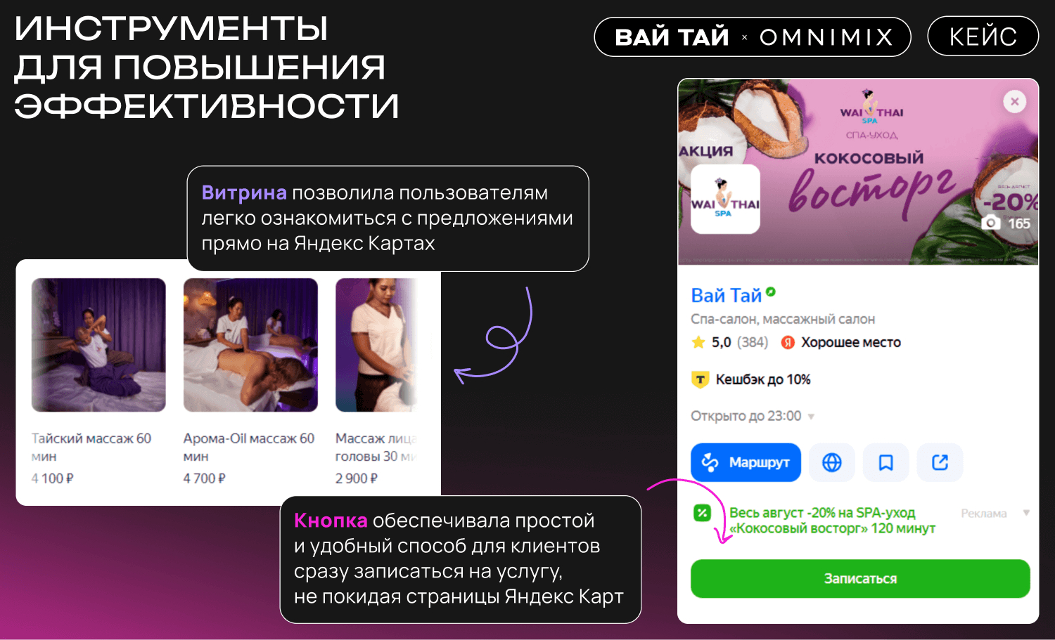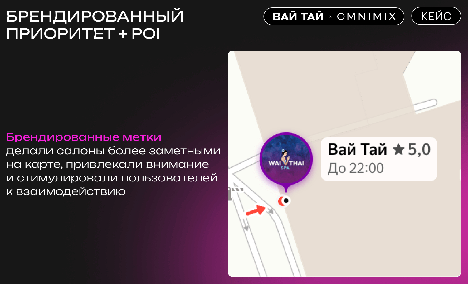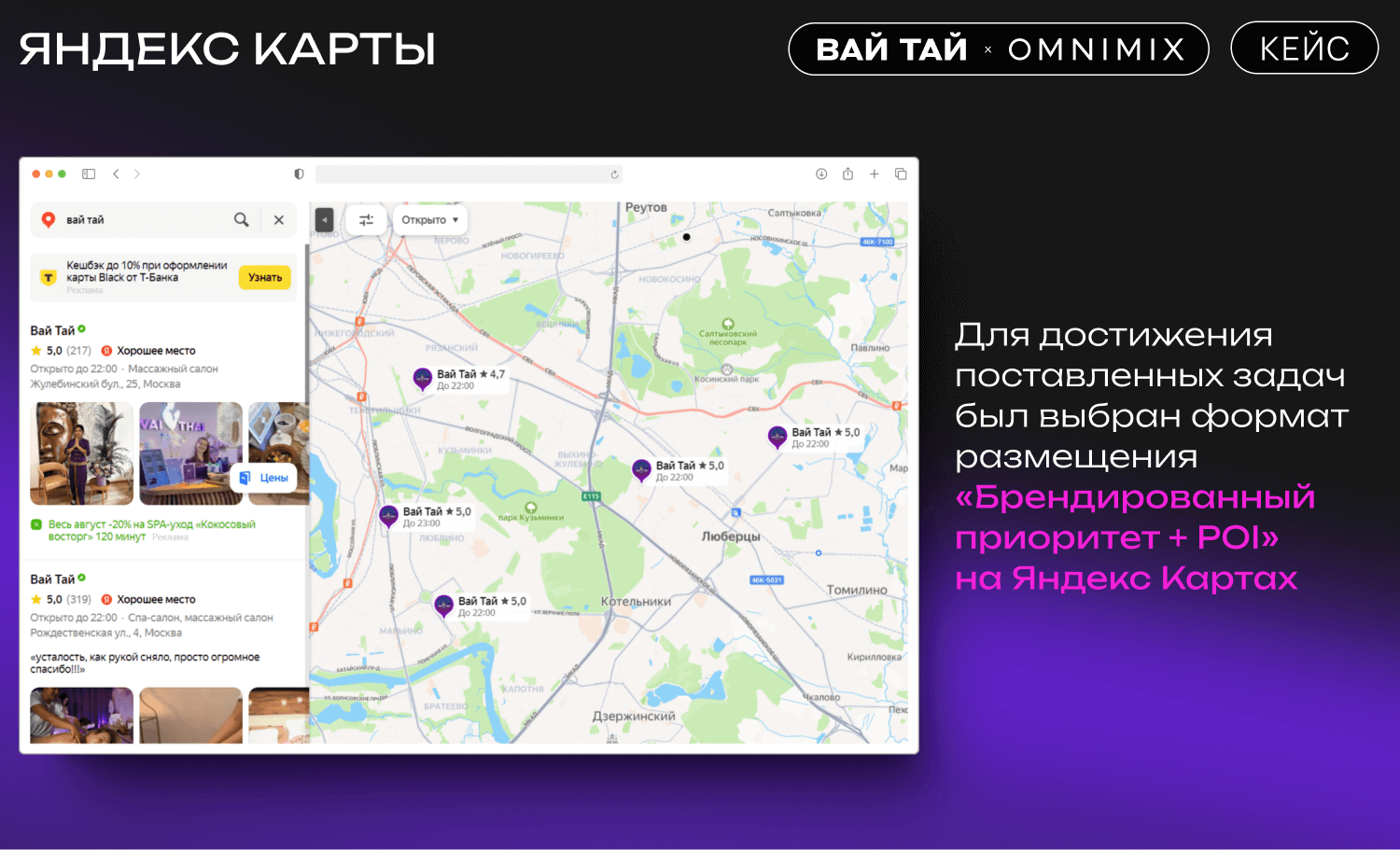 Основным инструментом кампании стал формат «Брендированный приоритет + POI», который позволял выделять точки салонов «Вай Тай» на Яндекс Картах с помощью брендированных меток. Эти метки делали салоны более заметными на карте, привлекали внимание и стимулировали пользователей к взаимодействию. При нажатии на брендированную метку открывалась карточка выбранного филиала, содержащая подробную информацию о салоне, его услугах, акциях и специальных предложениях.