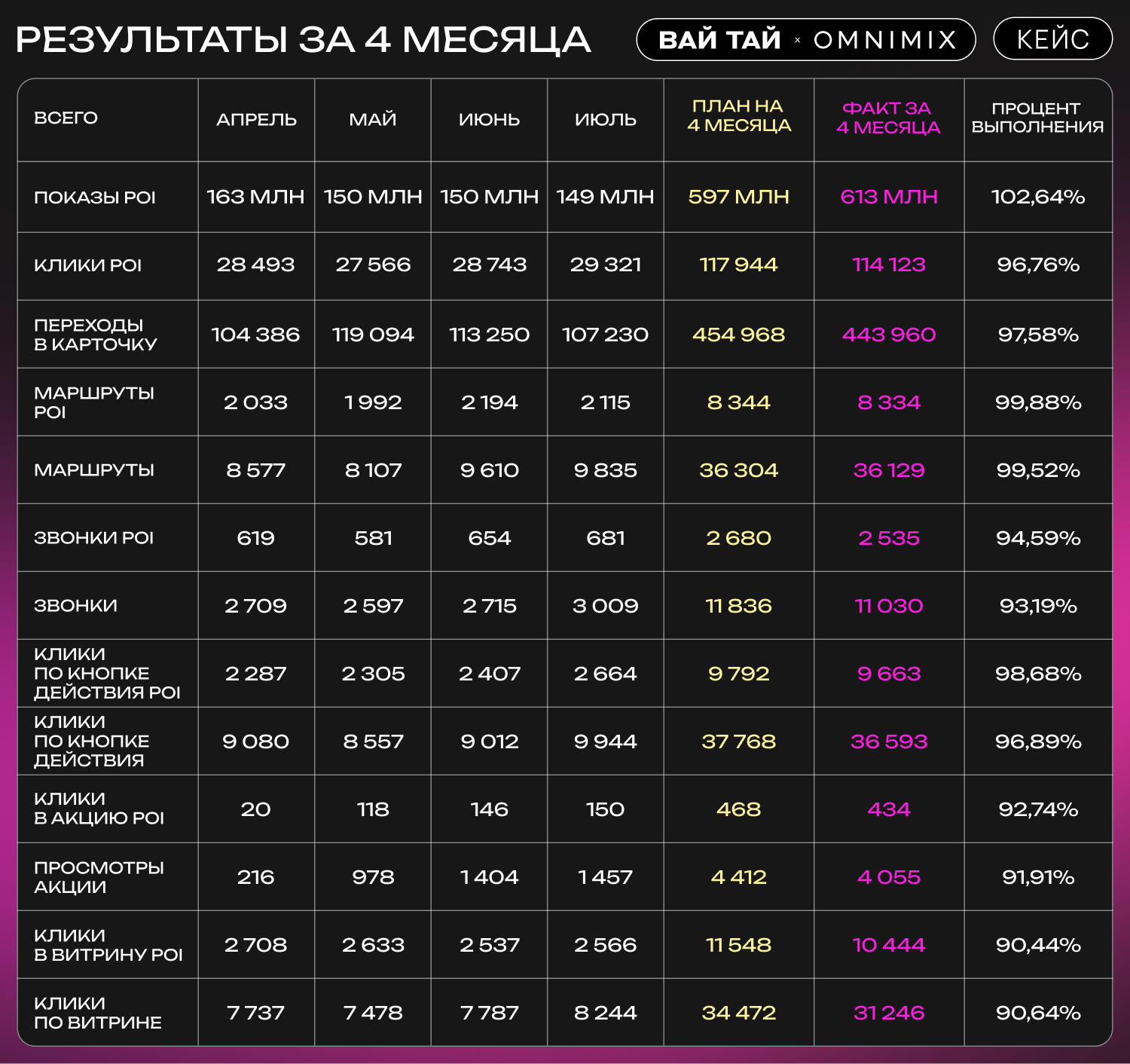 Хотя процент выполнения плана по кликам POI составил 96,76%, этот показатель близок к плановому. Важно отметить, что количество кликов стабильно увеличивалось в течение каждого месяца, начиная с 28 493 в апреле и достигая 29 321 в июле. Это свидетельствует о стабильном интересе пользователей к услугам «Вай Тай», несмотря на сезонные колебания.