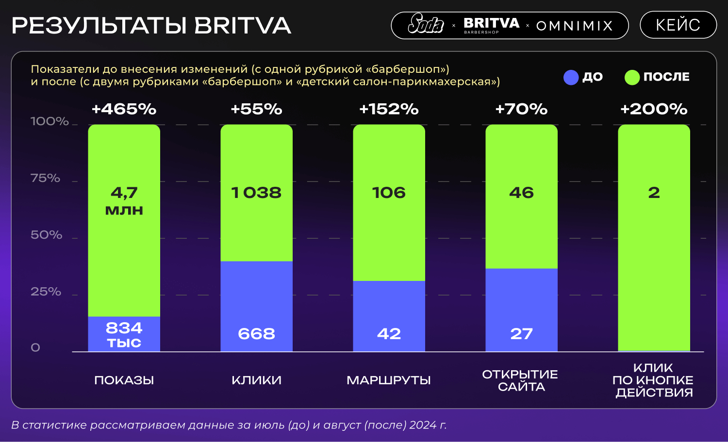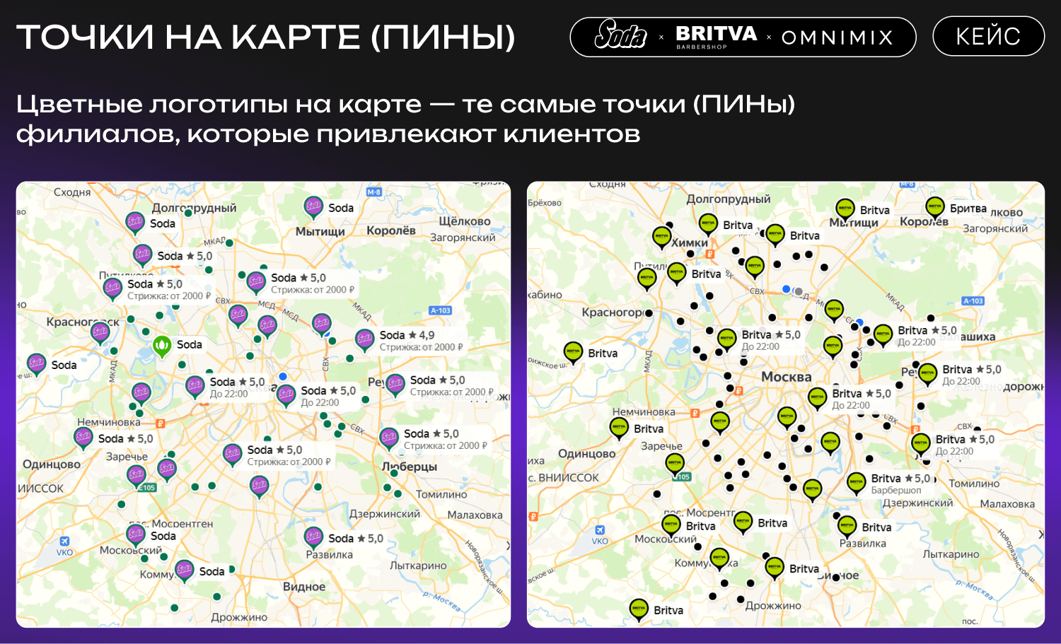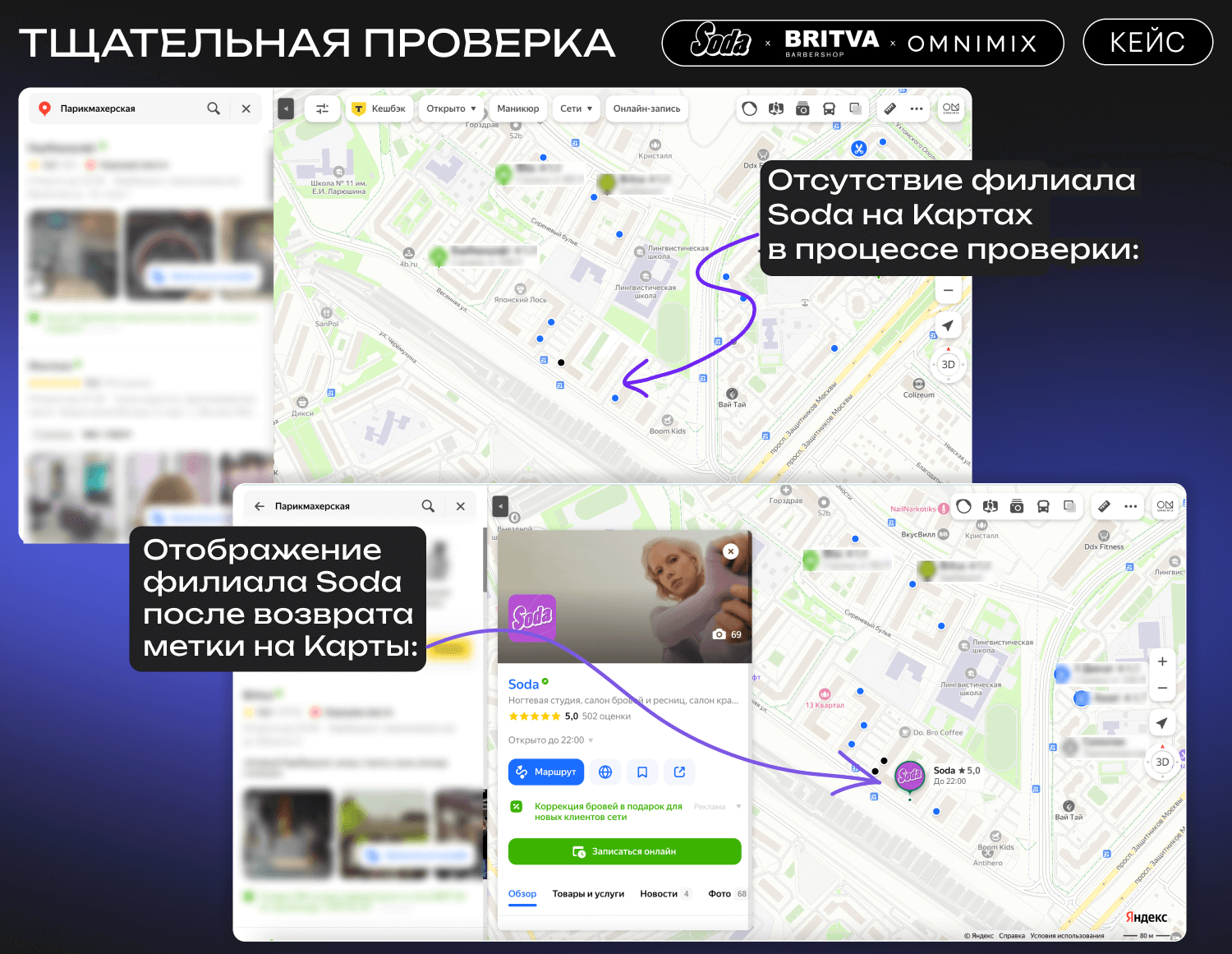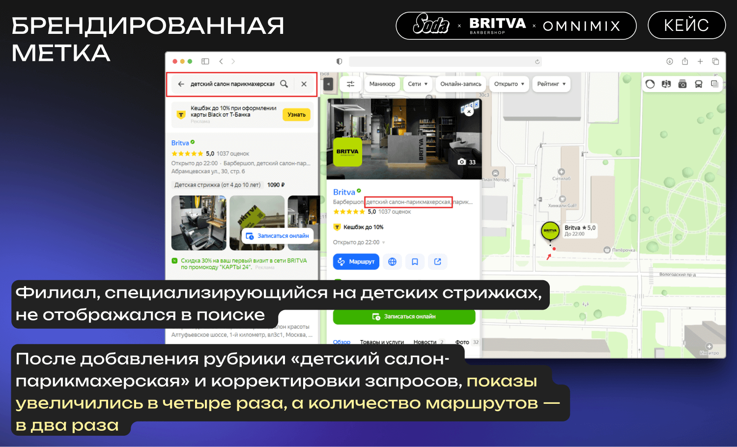 Филиалы Soda, работающие по широким запросам типа «салон красоты», сталкиваются с высокой конкуренцией на Картах. Узкие запросы, такие как «барбершоп» для Britva, позволяют стабильно удерживать видимость точек, так как конкуренция здесь менее интенсивна.