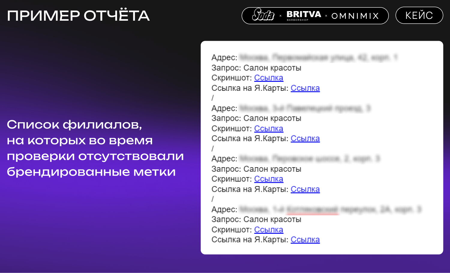 Soda и Britva используют формат размещения «Брендированный приоритет + POI» в Яндекс Картах, однако наши регулярные проверки показали, что метки некоторых филиалов периодически исчезают с Карт, а снижение видимость точек ведёт к падению количества новых клиентов у этих салонов, а также вызывает напряжение между Управляющей Компанией и франчайзи. Когда метки исчезают, франчайзи, которые уже оплатили за размещение рекламы, остаются недовольны и недополучают клиентов.