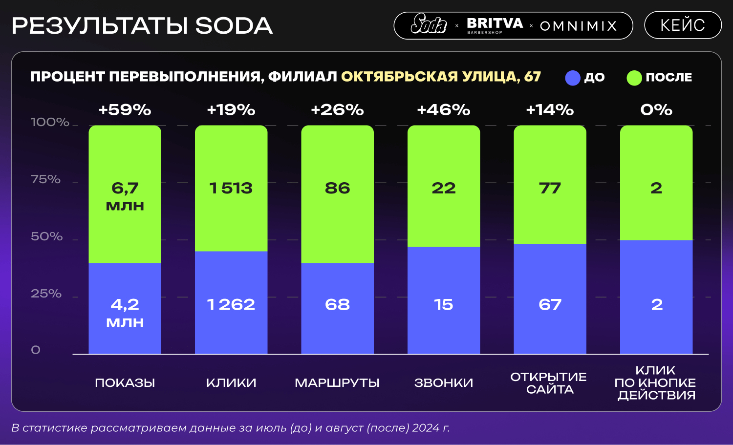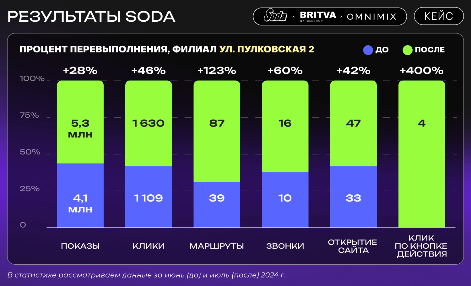После того как метка филиала Soda на ул. Пулковская, 2, была восстановлена на Яндекс Картах, мы наблюдали значительное увеличение всех ключевых показателей. Количество маршрутов увеличилось более чем в два раза — с 39 до 87 маршрутов. Это особенно важно, так как подтверждает, что клиенты действительно строят маршруты до салона, что напрямую влияет на посещаемость и доходы.