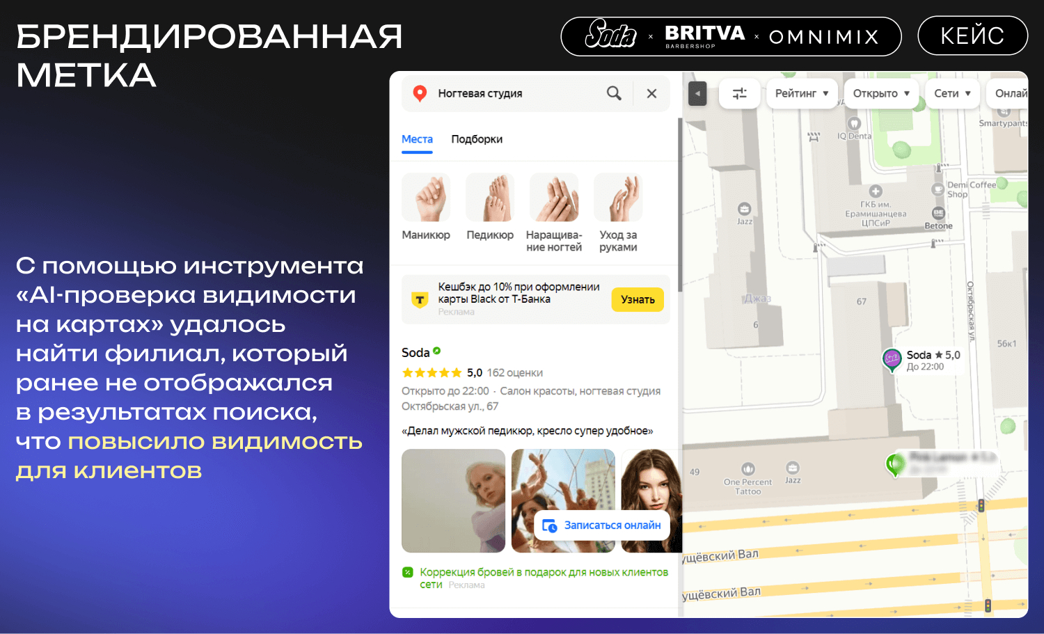 Другая проблема касалась филиала Soda на Октябрьской улице, который отображался только по брендовым запросам, но не показывался по запросам «ногтевая студия» и «салон бровей и ресниц». После анализа и корректировки настроек с помощью инструмента «AI-проверка видимости на картах» точка филиала была восстановлена на карте.