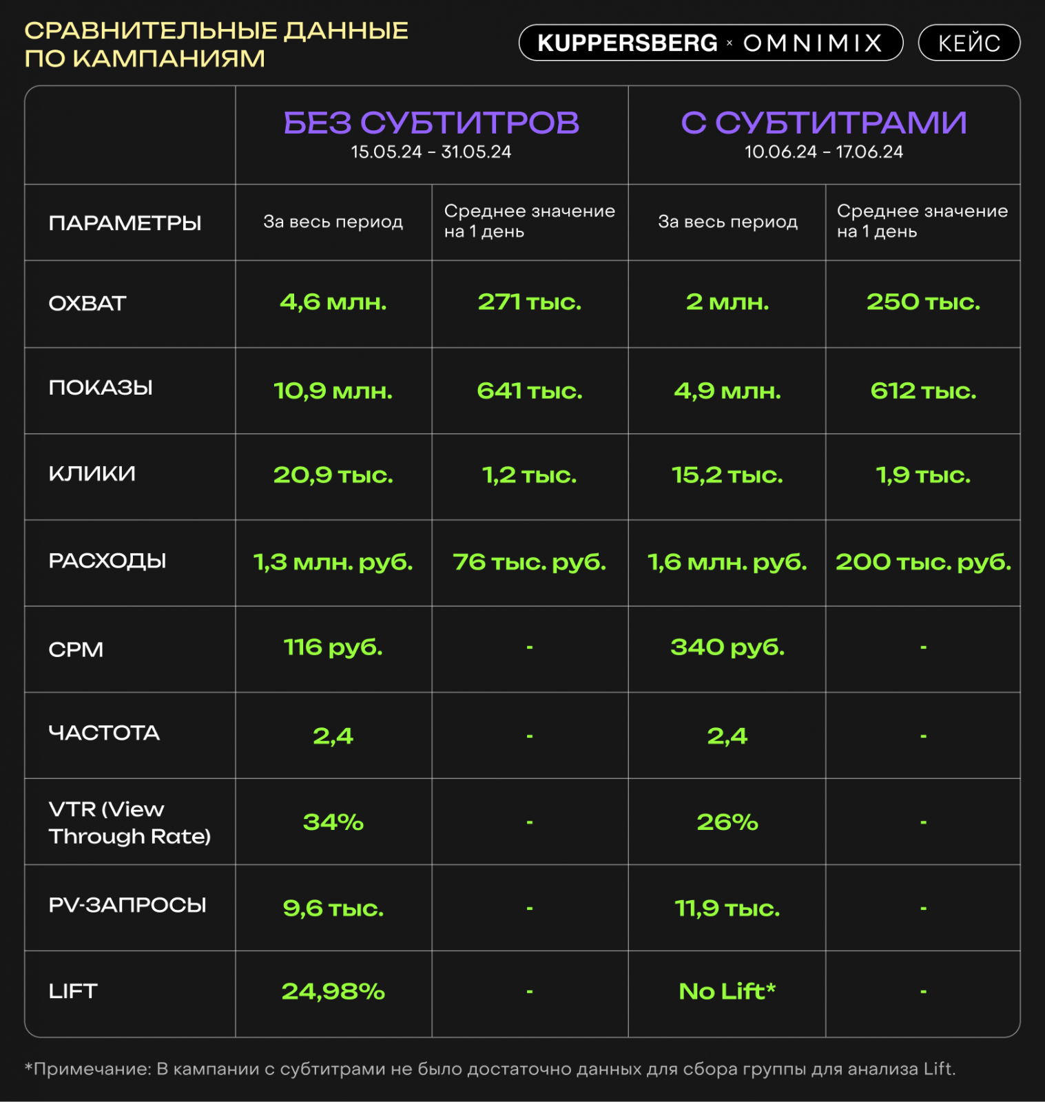 Представленная таблица сравнивает ключевые показатели эффективности рекламных кампаний KUPPERSBERG с субтитрами и без них. Несмотря на меньшую продолжительность, кампания с субтитрами продемонстрировала лучшую эффективность по всем основным метрикам.