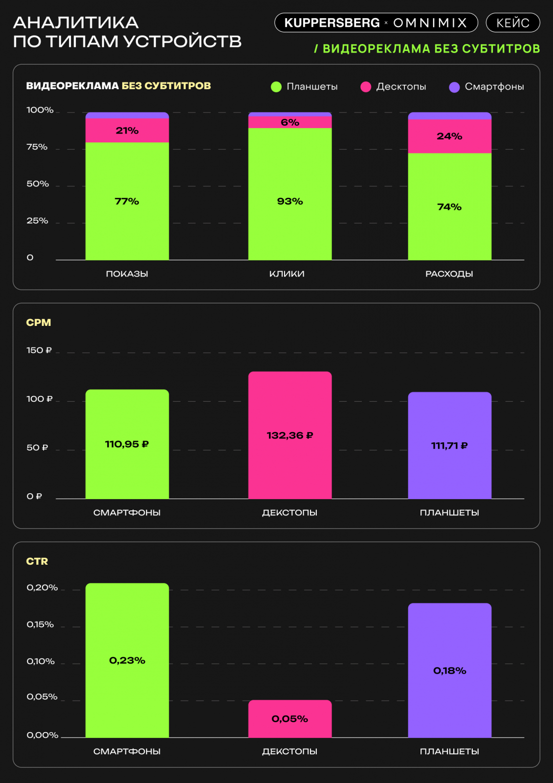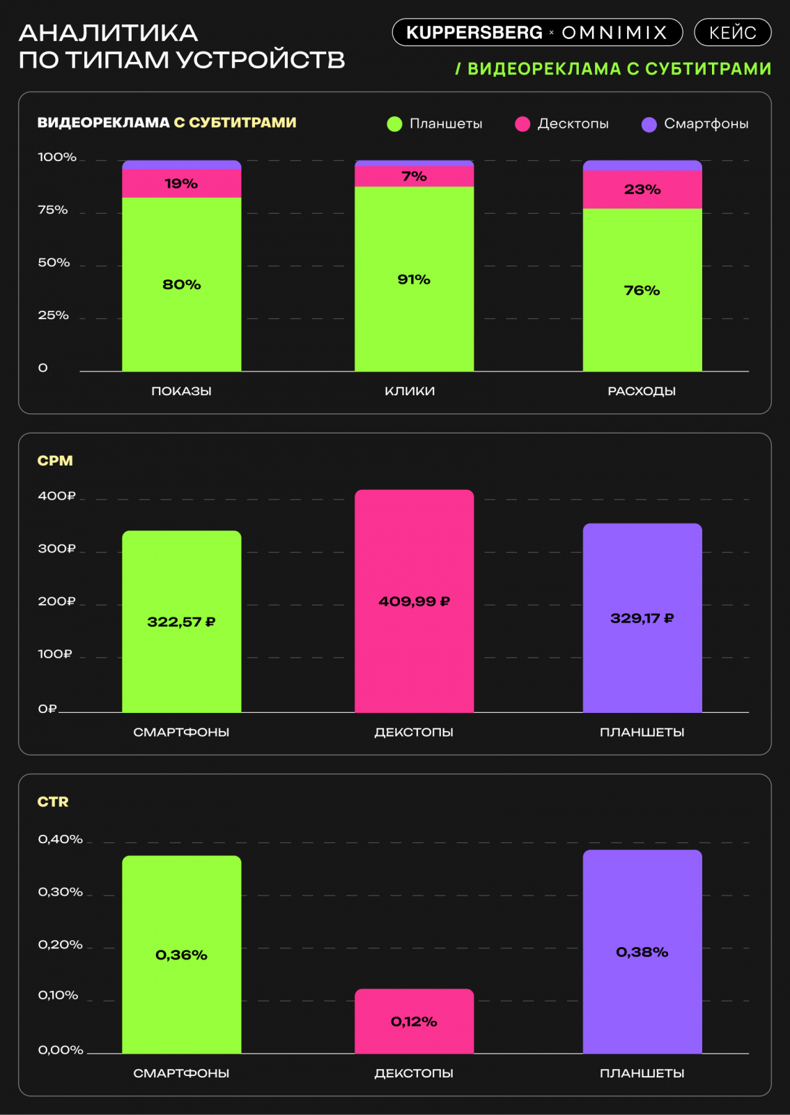 - Десктопы. На десктопах наблюдался высокий CPM — 409,99 рубля, однако CTR остался низким — 0,12%, аналогично предыдущей кампании без субтитров.