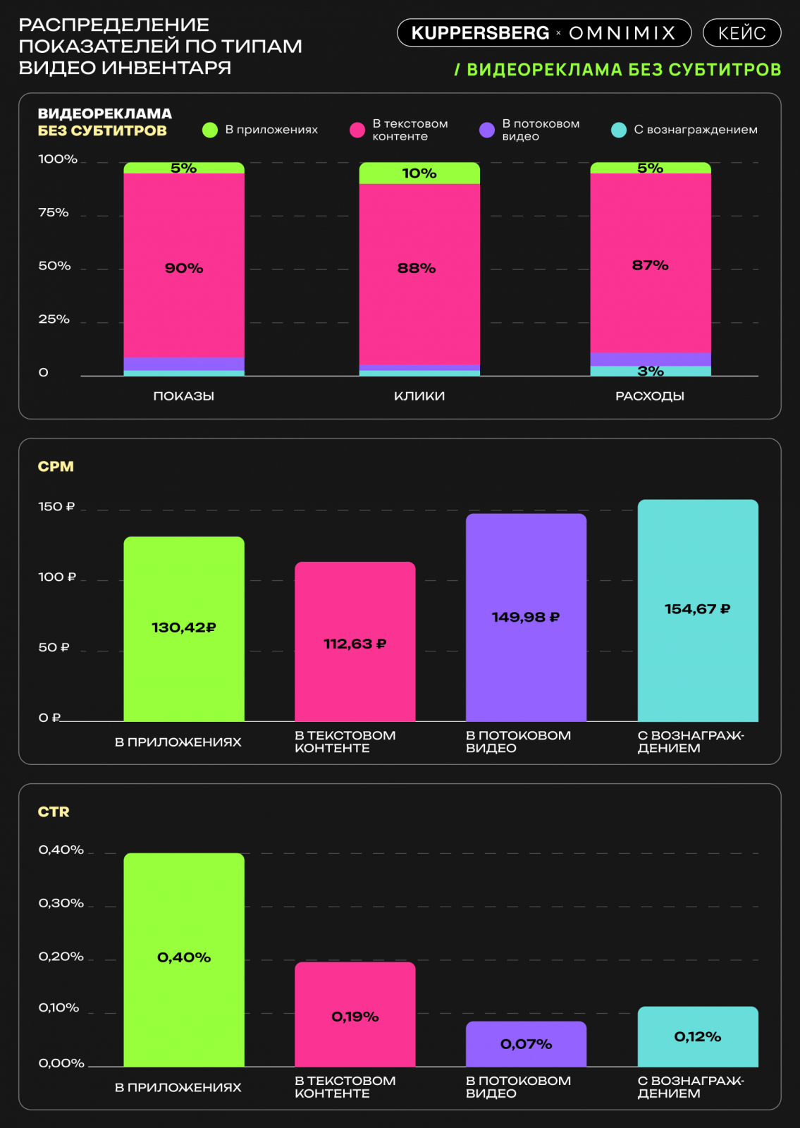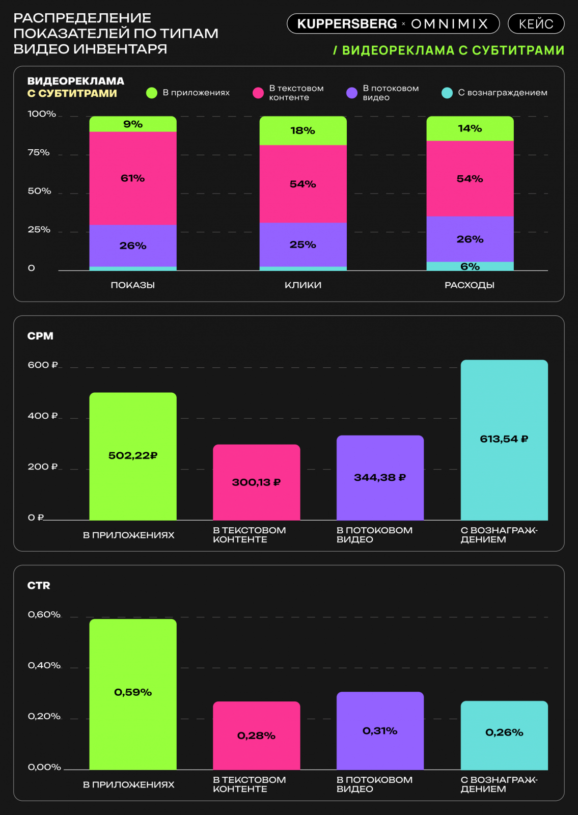 - Приложения. Увеличение доли показов и кликов в приложениях привело к наибольшему CTR — 0,59%, что свидетельствует о высокой вовлеченности аудитории, особенно при использовании субтитров.