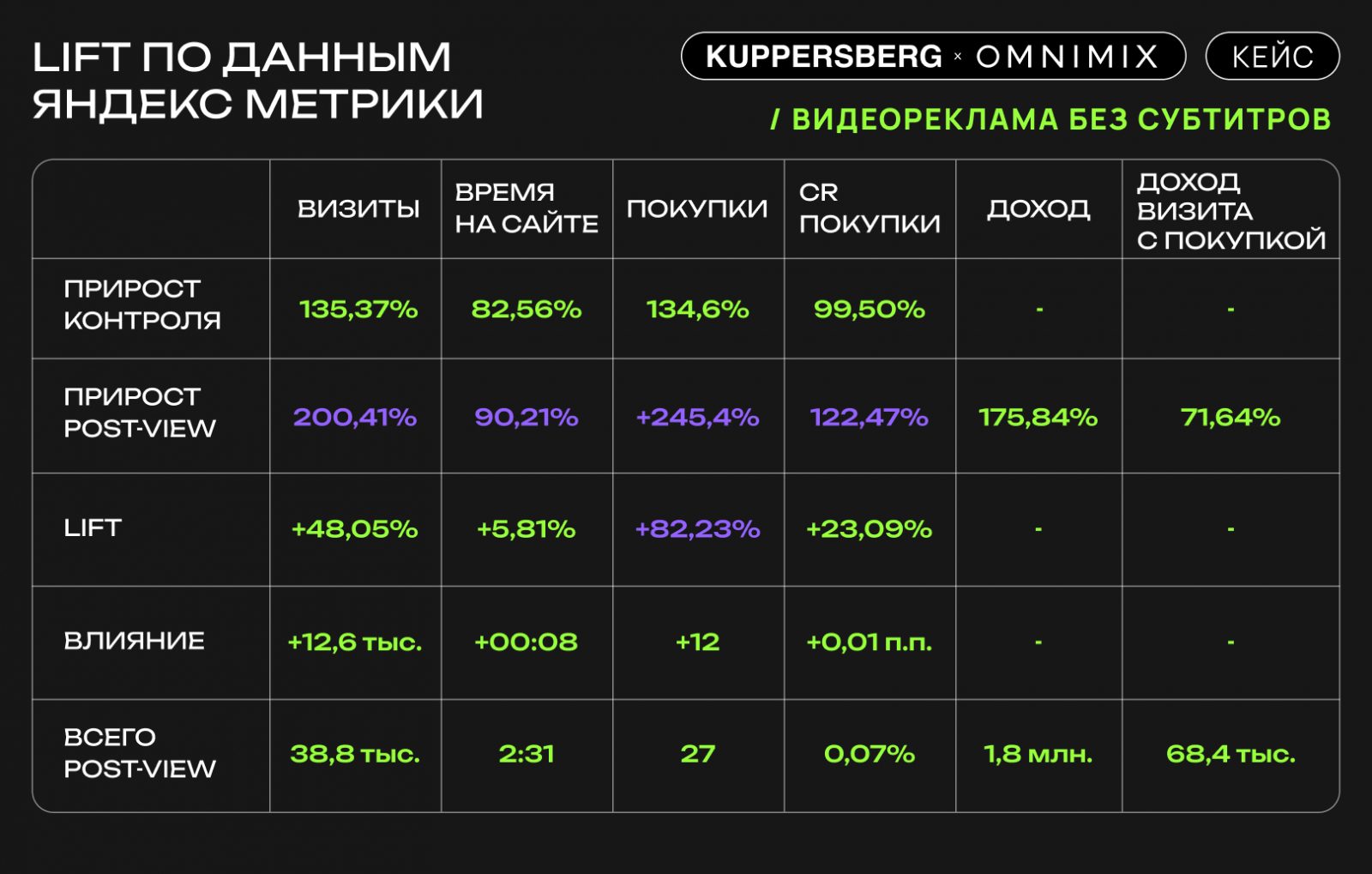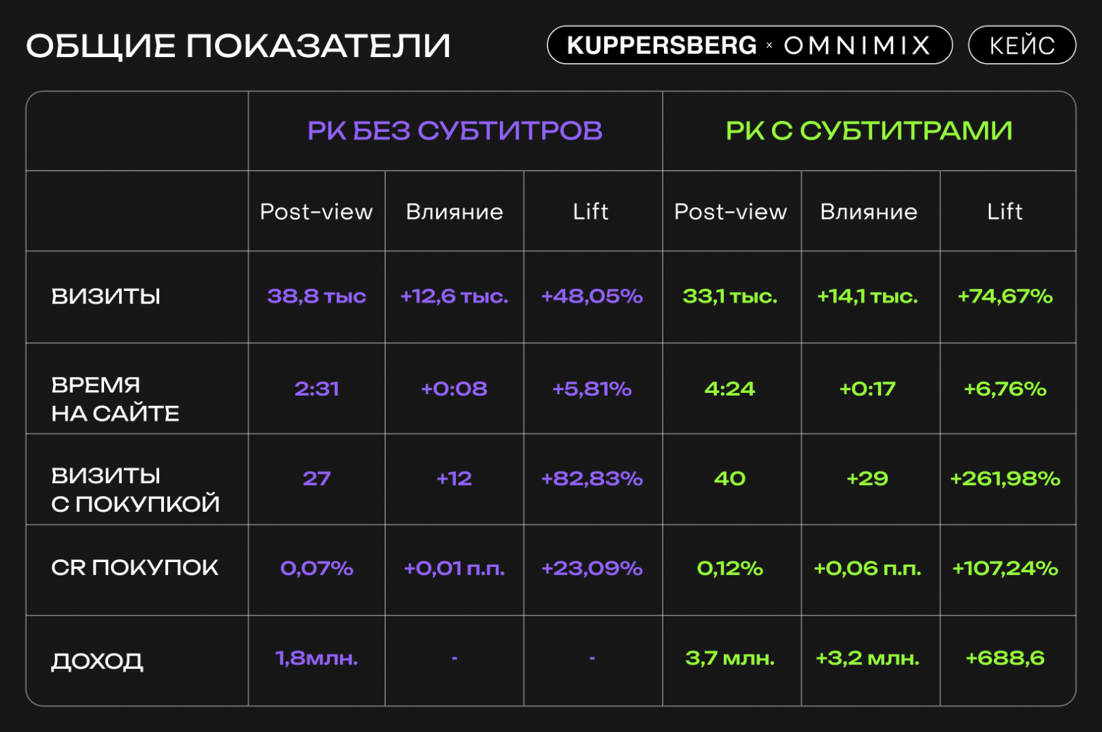- Визиты с покупкой. Прирост покупок в post-view составил 261,98%, что значительно превосходит результаты кампании без субтитров.