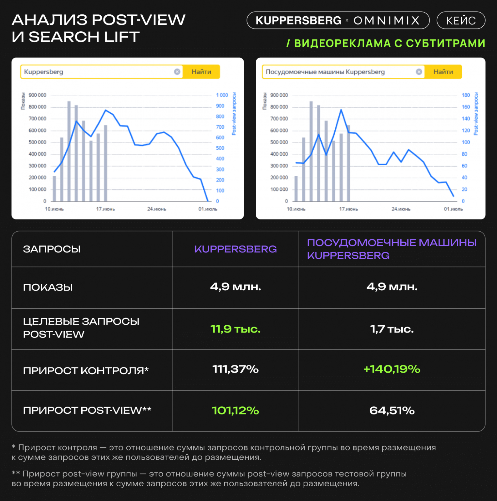 Рекламная кампания с субтитрами достигла высоких результатов как в охвате, так и в воздействии на аудиторию. Она способствовала значительному увеличению запросов как в контрольной, так и в post-view группах. Особенно эффективным оказался брендовый запрос "KUPPERSBERG", по которому было зафиксировано 11,9 тысячи целевых запросов post-view и прирост post-view на уровне 101,12%. Запрос "Посудомоечные машины KUPPERSBERG" также показал прирост контроля на уровне 140,19%, что свидетельствует о значительном интересе со стороны пользователей, которые не видели рекламу, но активность этих пользователей была ниже по сравнению с теми, кто видел рекламу.
