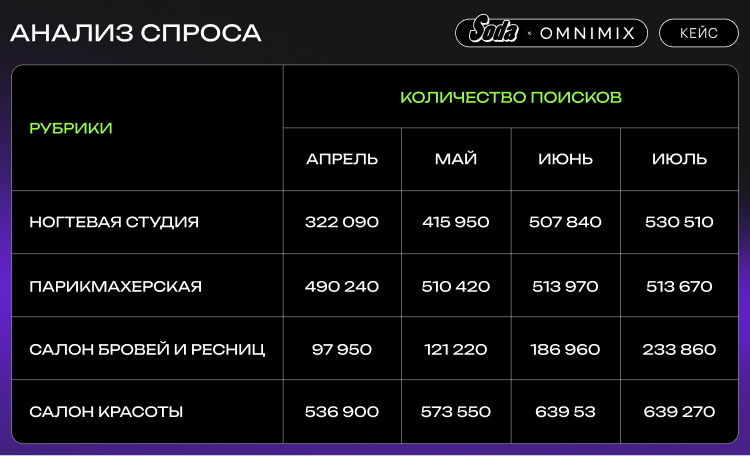 Практически во всех рубриках заметен рост спроса на услуги, особенно ближе к лету, что подтверждает сезонный характер индустрии красоты. Количество поисков по ключевым рубрикам подтверждает необходимость приоритета карточек Soda, чтобы не упустить целевую аудиторию.