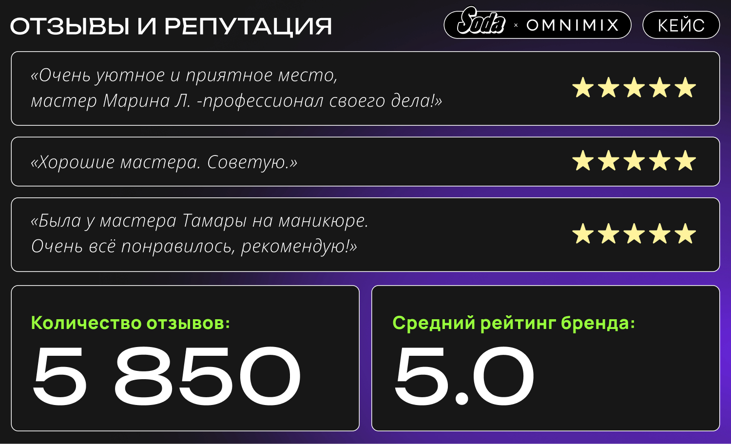 В ходе кампании клиенты оставляли исключительно положительные отзывы о салонах Soda. Средний рейтинг бренда составил 5.0 — высший возможный показатель.