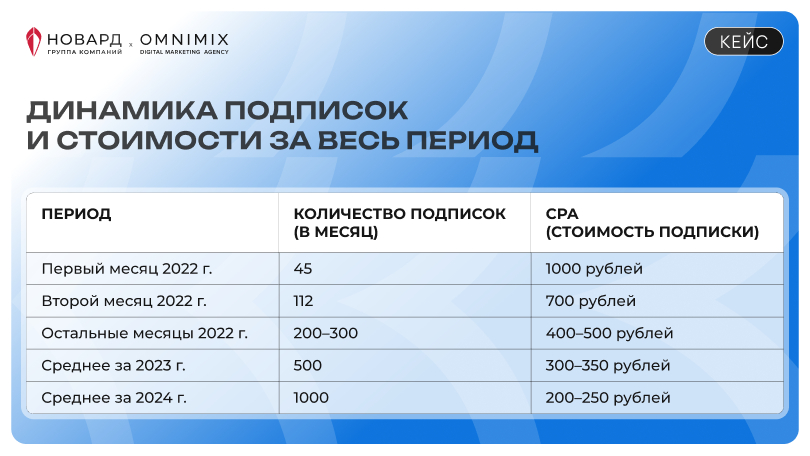 После запуска страницы ВКонтакте и настройки точечных таргетингов начали видеть стабильный рост подписчиков. Постепенно, с переходом на автотаргетинг и сужением географии до наиболее активных регионов, результаты улучшились, а стоимость подписки снижалась.