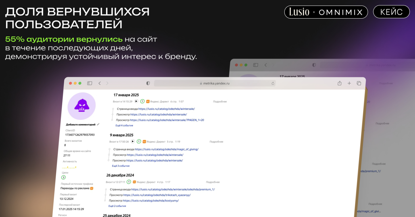 - Доля вернувшихся пользователей: 55% аудитории вернулись на сайт в течение последующих дней, демонстрируя устойчивый интерес к бренду.