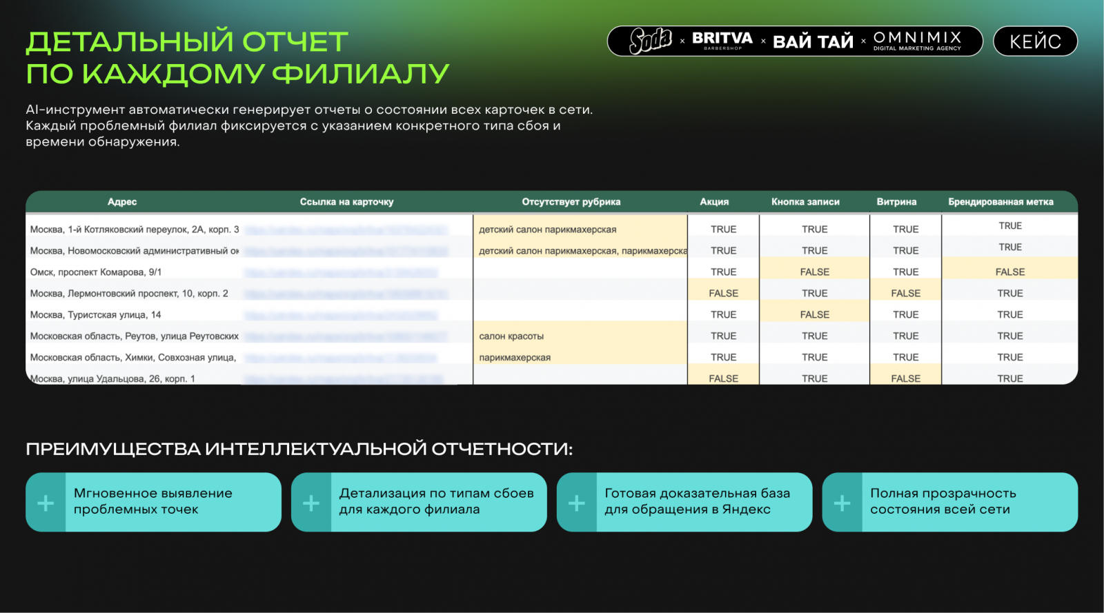 Внедрение усовершенствованного AI-инструмента кардинально изменило подход к контролю карточек на Яндекс Картах. Если раньше ошибки могли оставаться незамеченными по 2-3 дня, все это время бизнес терял клиентов и деньги, то теперь система выявляет проблему в течение нескольких минут, а команда сразу приступает к устранению.