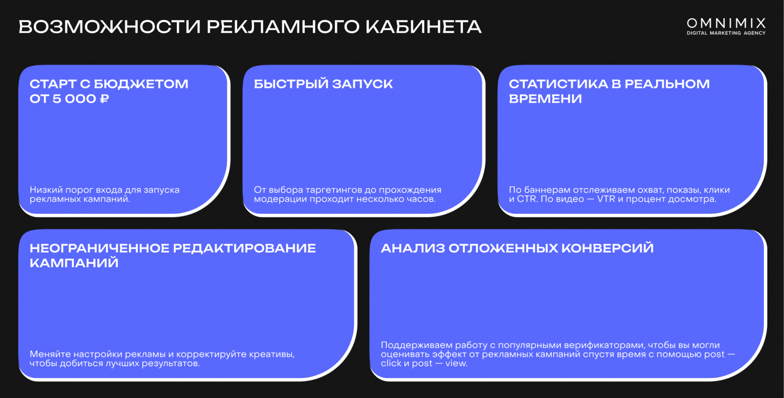 Стоит отметить, что порог входа среди рекламодателей остается низким — от 5000 ₽. Это открывает возможность протестировать несколько гипотез даже с небольшим бюджетом и определить результативные варианты рекламы.