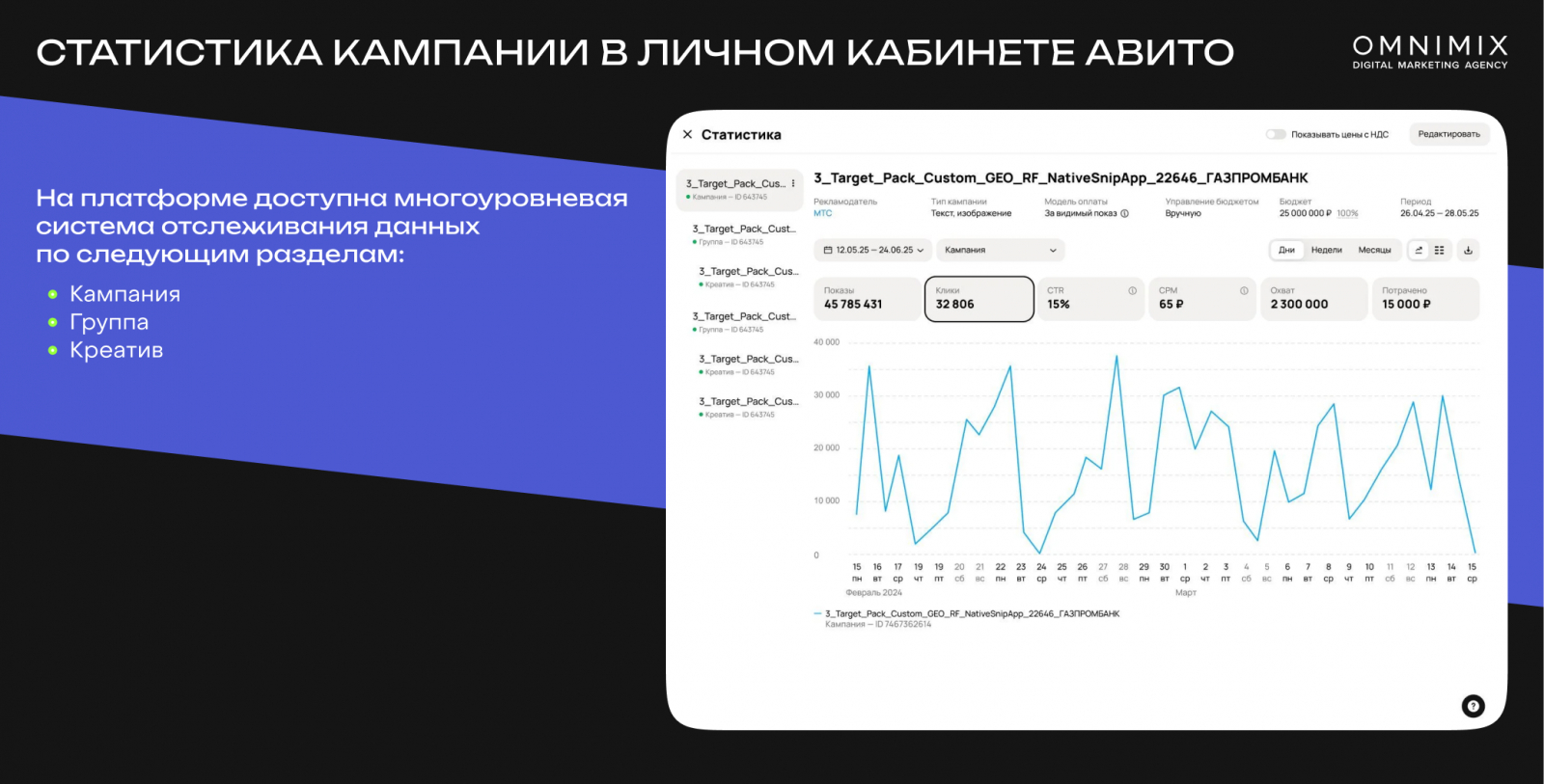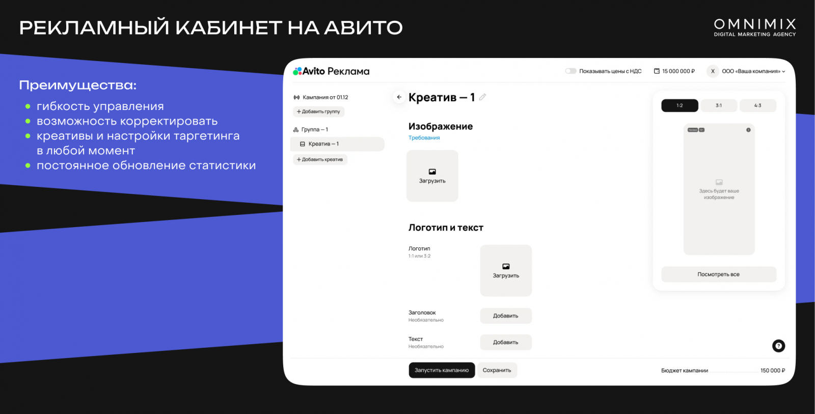 Ключевое преимущество рекламного кабинета Авито — гибкость управления. Креативы и настройки таргетинга можно корректировать в любой момент, а статистика обновляется с высокой частотой. Это позволяет бизнесу сохранять контроль над коммуникацией и расходами даже в условиях быстро меняющегося рынка.