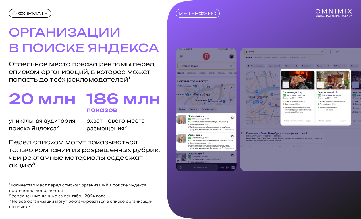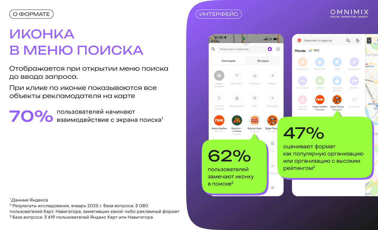 Инсайт: По данным практики OMNIMIX, геосервисы показывают особенно высокую эффективность для бизнесов с физическими точками продаж и локальным спросом. Пользователь, который ищет кафе «рядом со мной», находится в шаге от конверсии — и задача рекламы в этот момент не убедить, а подсказать правильный выбор.