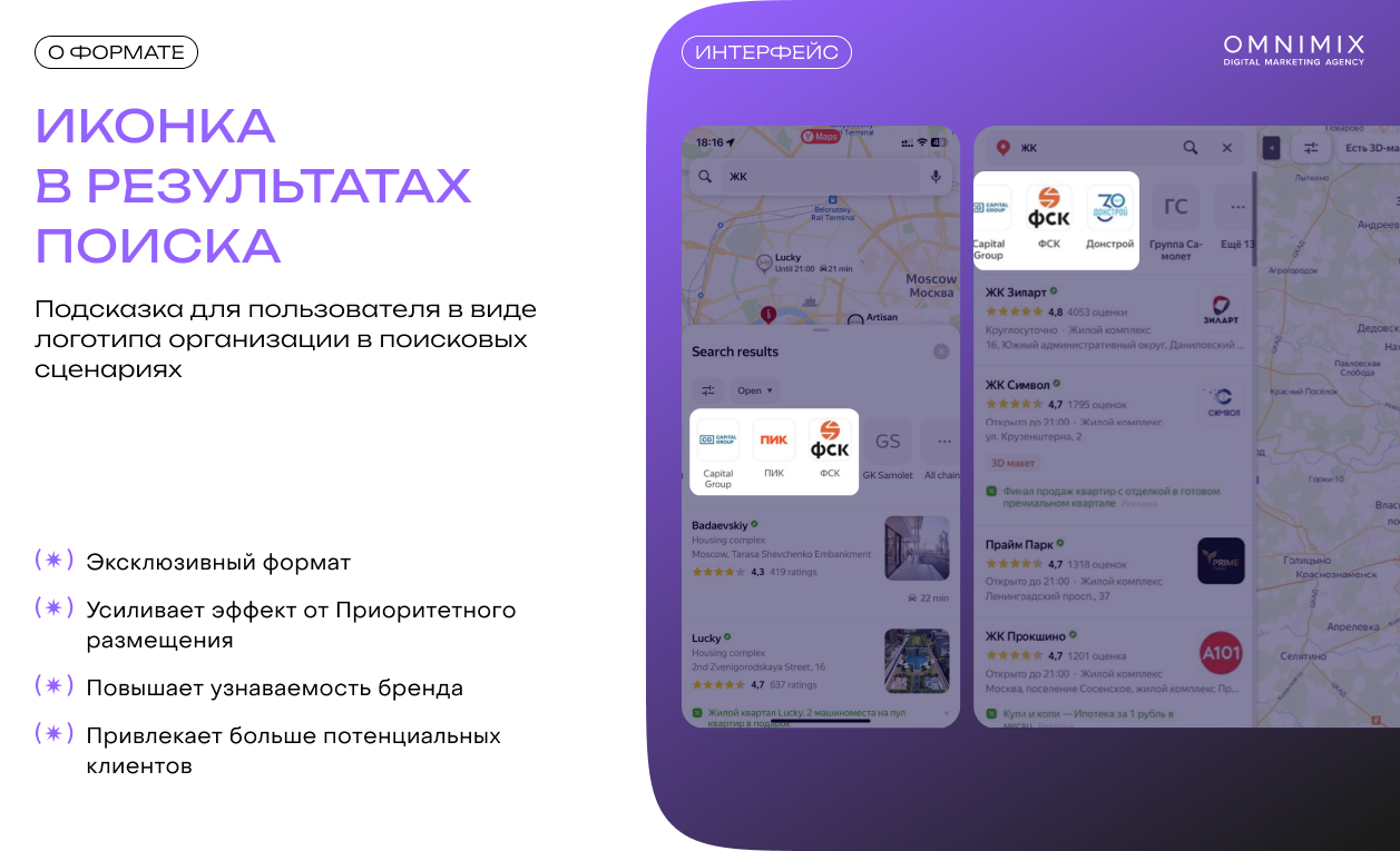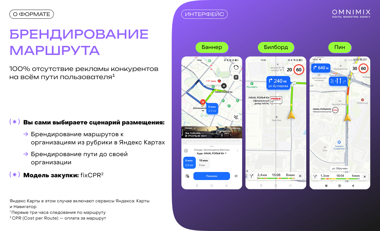 От узнаваемости (премиум-форматы, брендирование) до конверсии (пины, приоритетное размещение, рекомендации маршрутов). Это полноценный канал для решения любых маркетинговых задач.