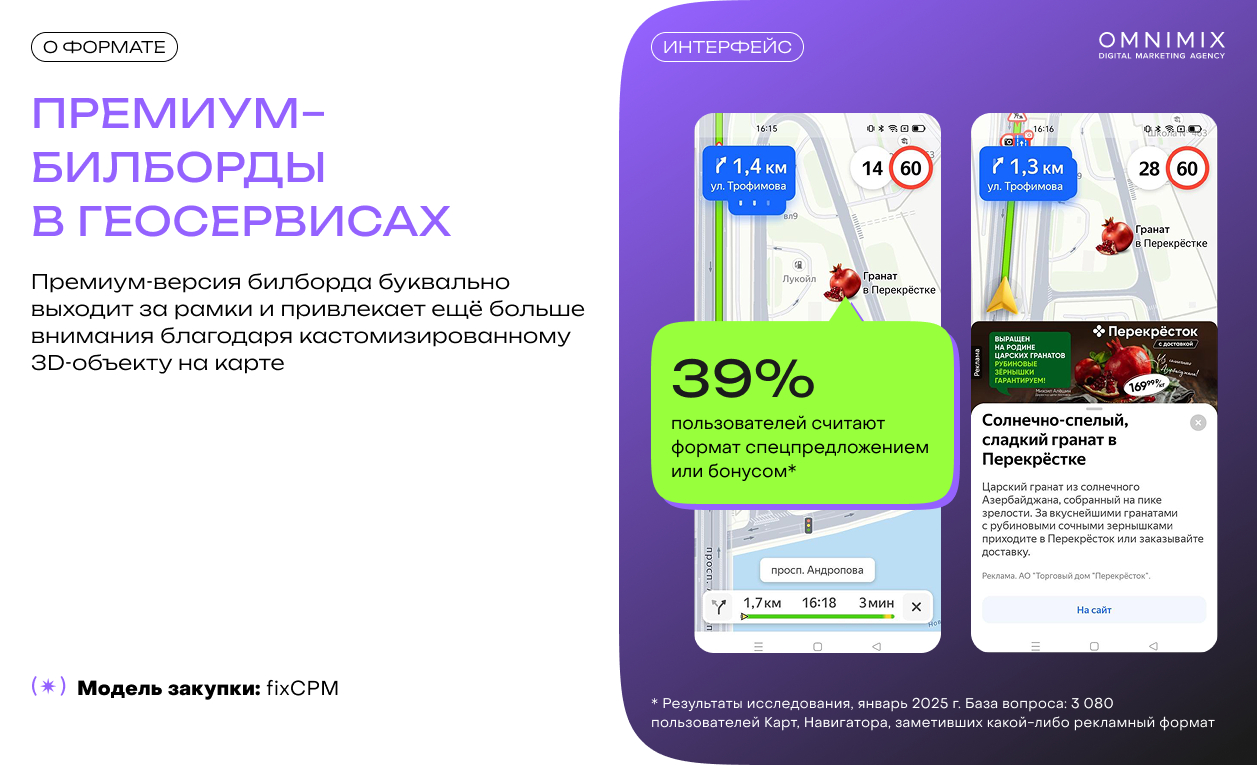 Рынок digital-рекламы смещается туда, где пользователи принимают решения о покупке — в сервисы, встроенные в их повседневные сценарии. Яндекс.Карты, Навигатор, Доставка и Go — это не просто инструменты навигации, а точки контакта с аудиторией в момент максимальной готовности к действию. В этом материале — исчерпывающий разбор всех рекламных форматов геосервисов Яндекса: от базовых инструментов до премиальных решений, с практическими рекомендациями и инсайтами от OMNIMIX.